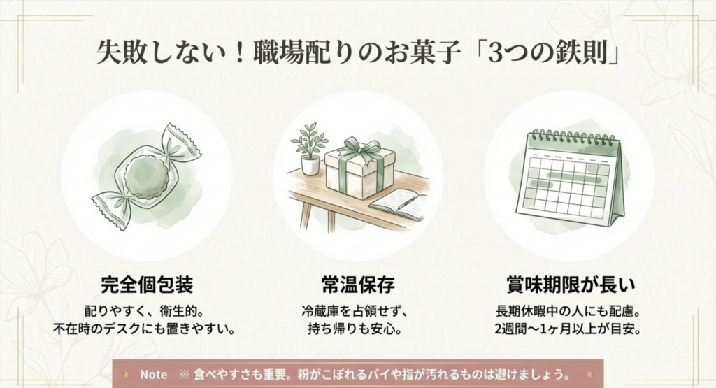 私がこれまでの経験で学んだ「失敗しないお菓子選びの鉄則」は以下の3点です。これらを無視して自分の好みだけで選んでしまうと、後で「配りにくい…」と後悔することになりかねません。