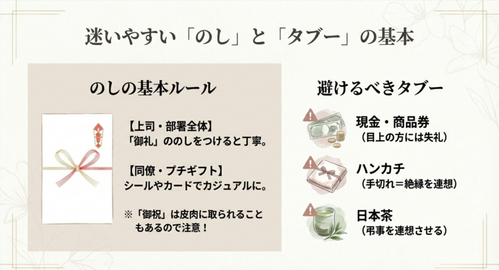 良かれと思って選んだプレゼントが、実はマナー違反だった…なんてことになったら、せっかくの感謝の気持ちも台無しです。特に、上司や年配の方、マナーに厳しい方が多い職場では、贈り物における「隠れた意味(語呂合わせや慣習)」に配慮する必要があります。