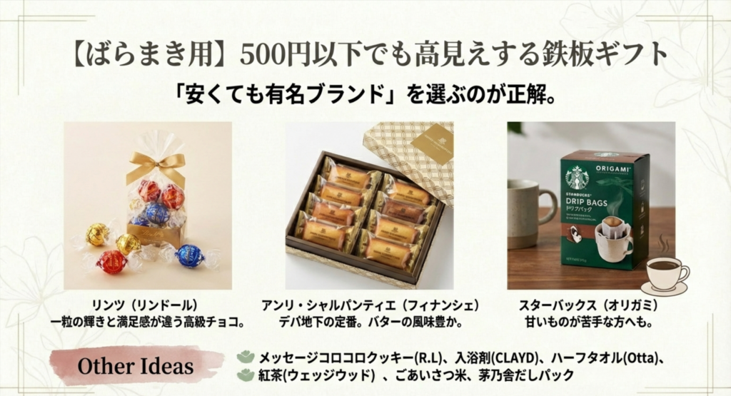 以下、500円以下(または1個単価が安く大量配布向き)で用意できるおすすめ10選です。