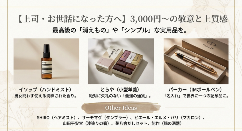 いわゆる「プチギフト」の領域です。相手がお返しを気にせず受け取れる金額でありながら、ばらまき用とは差別化された「特別な感謝」を伝えるのに最適なラインです。 - 直属の上司・特にお世話になった方:3,000円〜5,000円