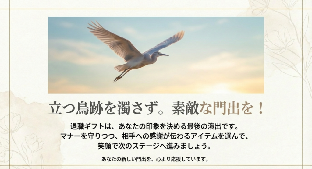 退職時のプレゼントは、単なるマナーや儀礼以上に、あなた自身の「印象」を決定づける最後のコミュニケーションツールです。「立つ鳥跡を濁さず」という言葉通り、去り際が美しければ、これまで築いてきた関係性は今後も続いていく「資産」となります。