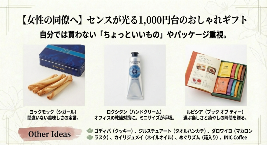 ランチ仲間や特に仲の良かった同僚へ贈る1,000円台のギフト。この価格帯のテーマは「Affordable Luxury(手の届く贅沢)」です。ドラッグストアやコンビニで買えるものではなく、デパートや専門店でしか買えない、自分では普段買わないような「ちょっといいもの」を選ぶと、相手の心に響きます。