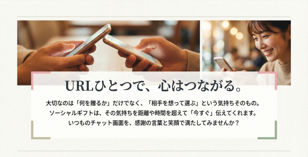 住所を知らなくても、思い立ったその瞬間に気持ちを届けられるソーシャルギフトは、物理的な距離を超えて人と人を繋ぐ、今の時代にぴったりの贈り方です。「形に残るものを贈る」ことだけがギフトではありません。大切なのは「何を贈るか」だけでなく、「相手を想って選ぶ」という気持ちそのもの。そして、その気持ちを「今すぐ伝える」ことができるのが、ソーシャルギフトの最大の価値なのです。