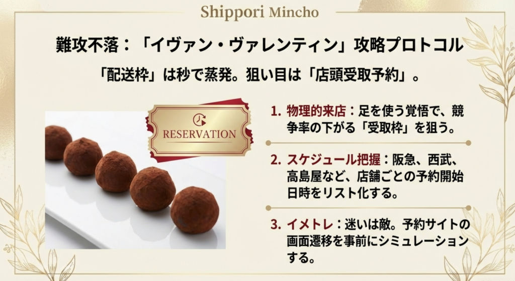 イヴァンに限らず、パトリック・ロジェやベルナシオンといった直輸入系の超人気ブランドも同様です。「配送」にこだわらず、「足を使う」覚悟を決めることが、幻のチョコレートを手にする最短ルートかもしれません。もし、どうしても配送が良い場合は、複数のデバイス(PCとスマホなど)で待機し、最も繋がりやすい回線で挑むしかありませんが、やはり確実性を取るなら店頭受取が最強のカードとなります。