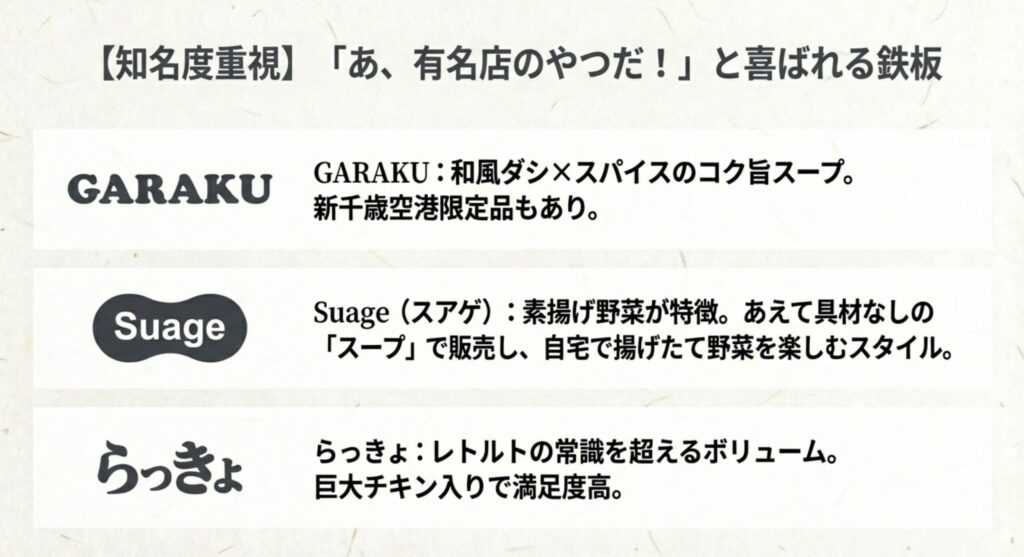 - 失敗したくない王道ギフト: 知名度抜群の「GARAKU」、ボリューム満点の「らっきょ」
