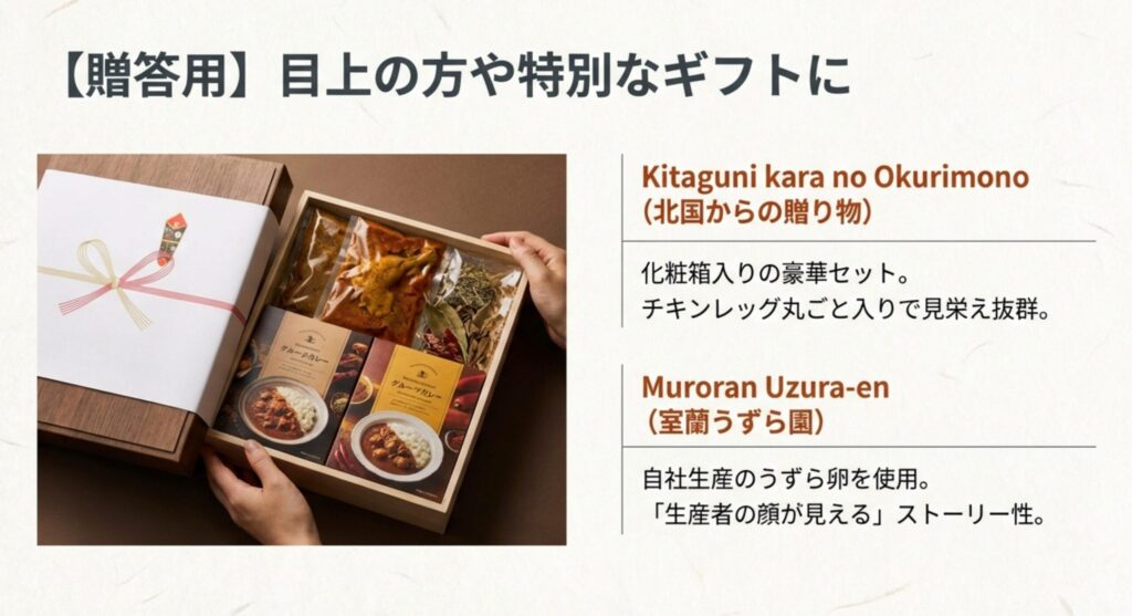 お世話になった上司への昇進祝い、両親への感謝の贈り物、あるいは結婚祝いの内祝いなど、少し改まったシーンでは、パッケージの質感や具材の豪華さにこだわりたいところです。「センスが良い」「高級感がある」と思わせる、プレミアムなスープカレーをご紹介します。