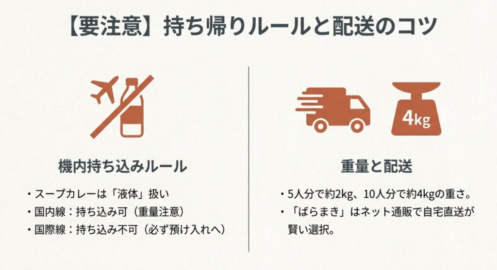 最高のお土産を選んだら、次は「どうやって持ち帰るか」が問題です。スープカレーは液体であり、非常に重量があります。空港での効率的な立ち回りや、重さを回避する賢い購入方法、そして持ち帰った後に美味しく食べるコツを知っておくことが、旅の締めくくりを快適にします。