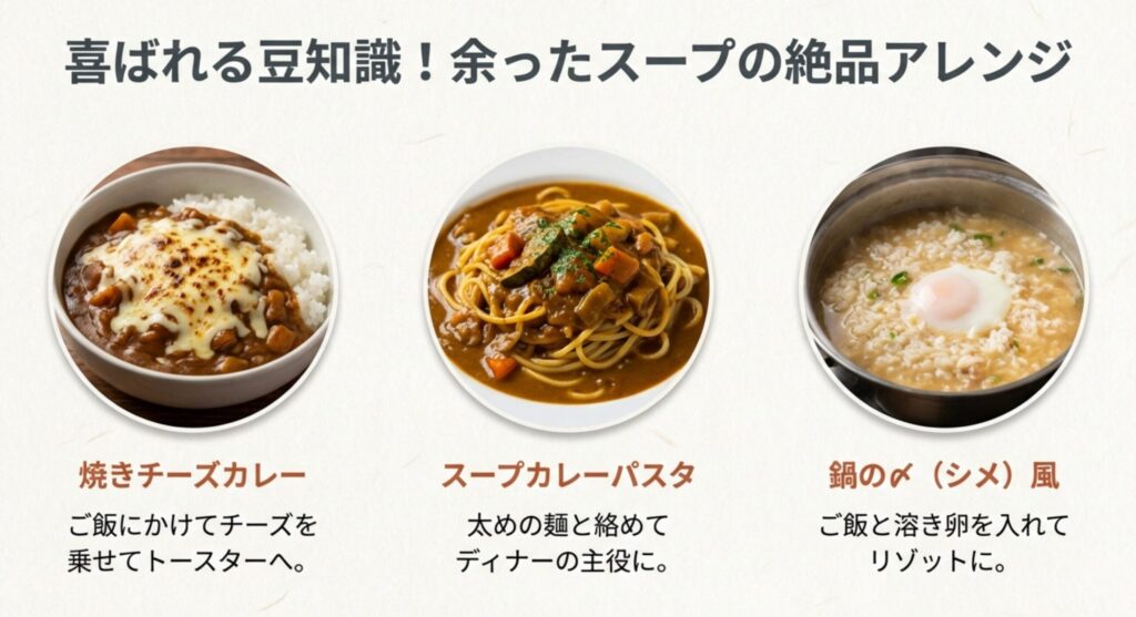 「もしスープが余ったら、ご飯にかけてチーズを乗せて焼いてみて。最高だから!」と伝えてください。耐熱皿にご飯とスープを入れ、とろけるチーズをたっぷり乗せてトースターへ。香ばしいチーズとスパイスの相性は最強です。簡単なのに絶品、夜食にもぴったりです。