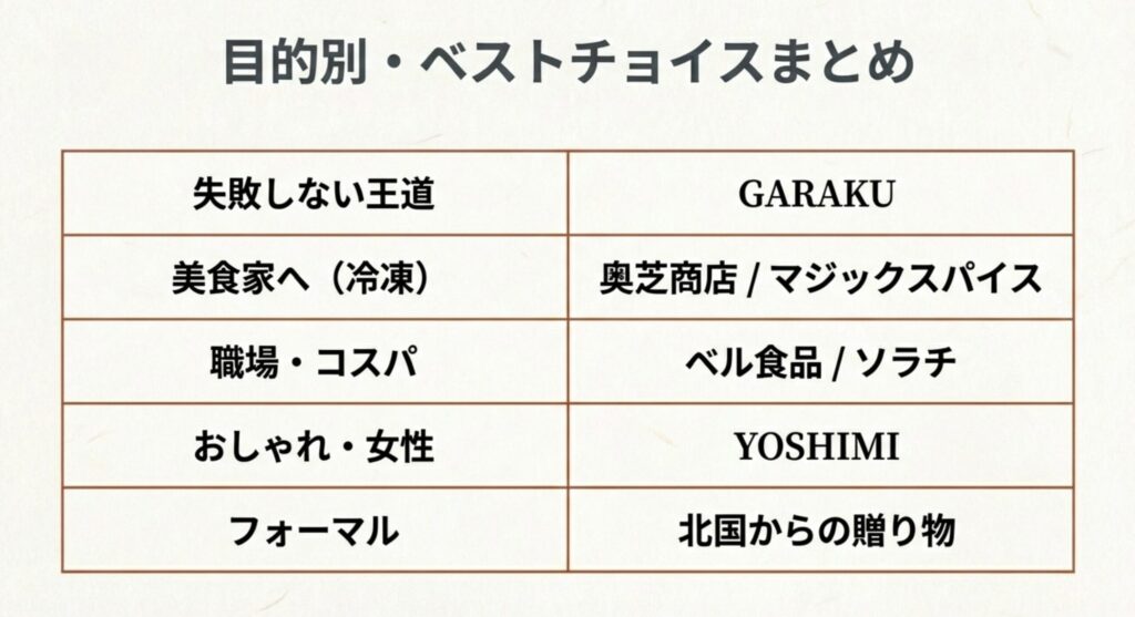 今回は、北海道土産の定番スープカレーについて、2026年最新の選び方やおすすめ商品をご紹介しました。最後に、改めて目的別のベストチョイスを整理しておきましょう。