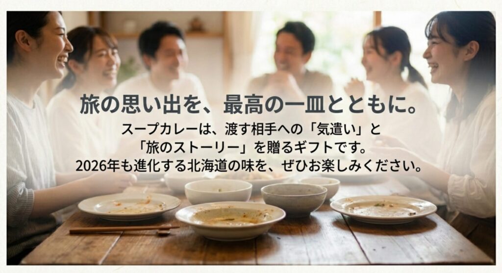 2026年も、北海道のスープカレーは進化し続けています。美味しいだけでなく、贈る相手への「気遣い」や「旅のストーリー」も一緒にパッケージできるのが、スープカレーギフトの魅力です。ぜひ、あなたの旅のスタイルや渡す相手の笑顔を思い浮かべながら、最高の一皿を選んでみてください。そして、一口食べた瞬間に広がるスパイスの香りで、素敵な北海道の思い出が鮮やかに蘇りますように。