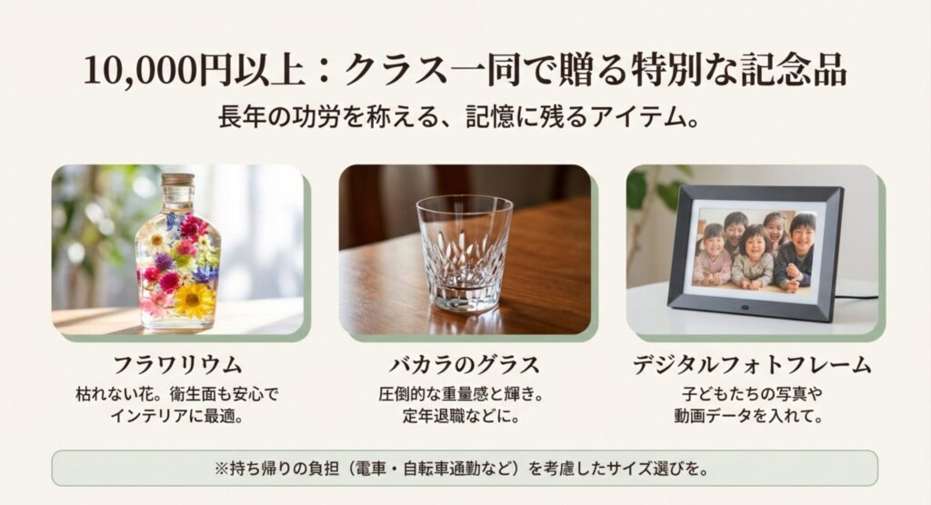 クラスの保護者会で「1家庭500円」といった形で資金を取りまとめ、総額10,000円以上の予算が確保できた場合、一生の記憶に残る記念碑的なアイテムを贈ることができます。