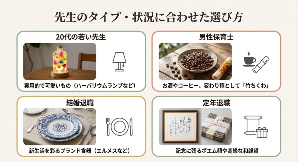 ※ただし、マナーには例外もあります。例えば相手が20代の若い先生で、別の保育園への転職が明確な場合、実用的な名入れのボールペンや可愛い靴下などを「次の職場でも頑張ってください」という文脈で贈れば、喜んで受け取ってもらえることも多いです。伝統的なタブーを知識として持った上で、先生の年代や関係性に合わせて柔軟に判断してみてくださいね。